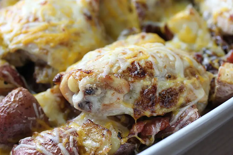 - Crumble the bacon and gently mix it into the potato mixture. Spoon potato mixture into a lightly sprayed 13×9 casserole dish, remove the chicken from the marinade and arrange the thighs on top of the potato mixture. Bake for 55 min to an hour, or until chicken is done.