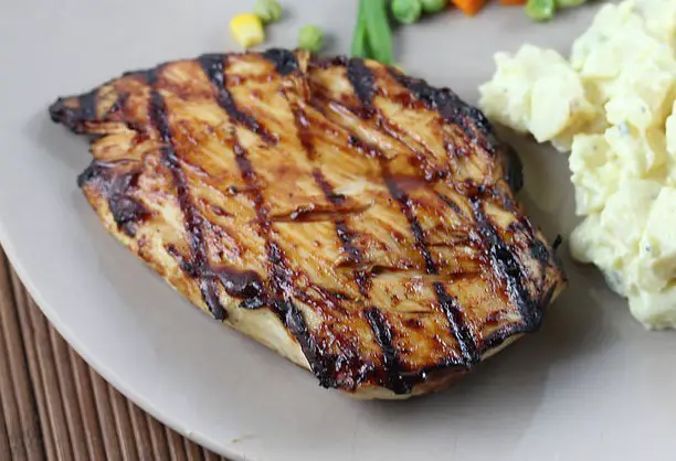 - Remove chicken from the marinade; letting any excess marinade drip off the chicken. Pat chicken dry using paper toweling. Coat chicken breasts on both sides with olive oil and lightly salt both sides. Grill chicken for 2 to 4 minutes or until grill marks form, flip chicken and grill for another 3 to 4 minutes, coat with barbecue sauce, flip chicken to coat the other side. Continue grilling until an instant-read thermometer reads 160F. (if you have sauce left over flip chicken again to thicken the coating)
