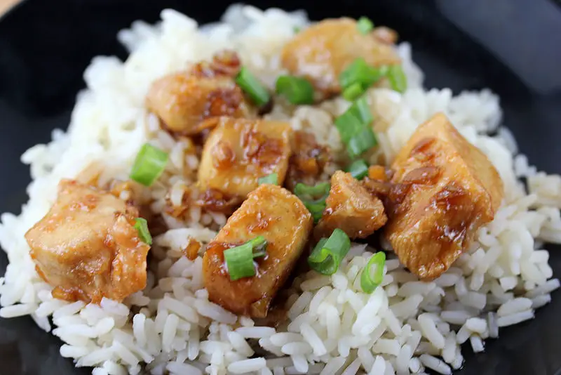 - Place the chicken in a large bowl, add the sauce, and mix until chicken is well coated; serve hot over rice garnished with green onion slices.