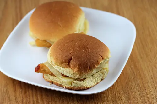 - Place 1 fish fillet or 4 fish sticks on the bottom half followed by a tablespoon of chili sauce; then top with a slice of cheese.