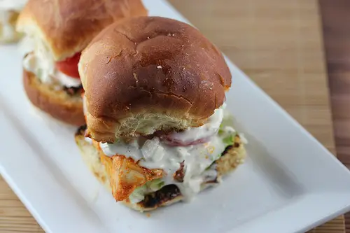 - Serve the sliders by placing a leaf of lettuce, piece of chicken, slice of tomato, and then top with the blue cheese sauce.