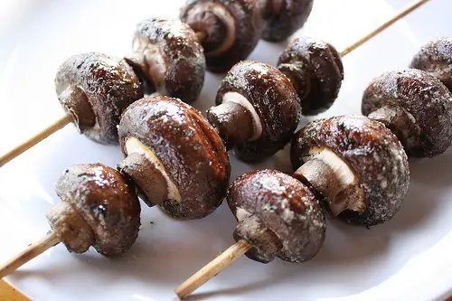 This is a simple grilled mushroom recipe that goes great with any steak. Be sure to soak the skewers in water overnight to keep them from catching fire.
