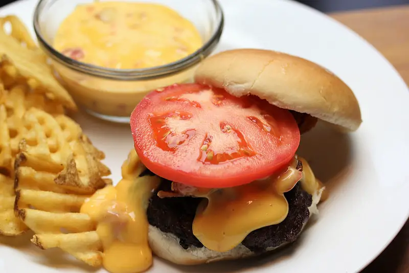 - Put burgers together on the buns starting with the burgers, 2 tablespoons of the cheese sauce, 2 slices of bacon, and then a slice of tomato.