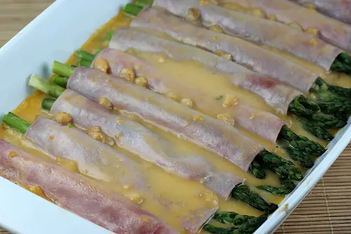 - Divide the asparagus between the 10 slices of ham, roll them up and place them seem side down in a 13 x 9 casserole dish sprayed with cooking spray.