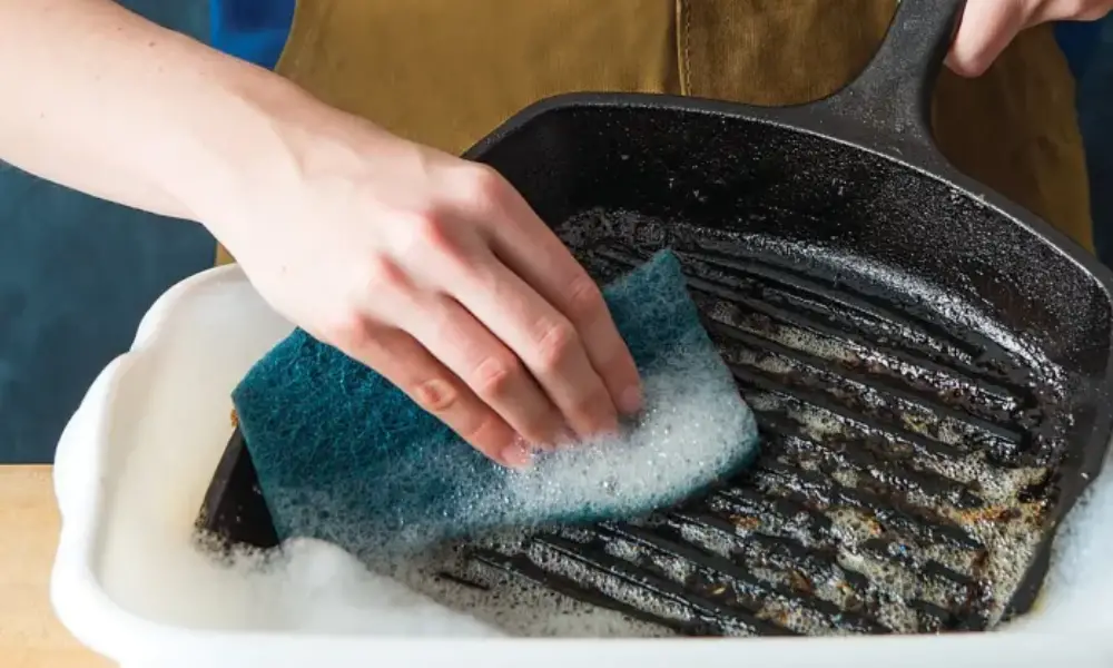 Cleaning the grill pan is best done using a nylon or soft sponge. Never use soap since it might harm the enamel. To avoid scratching the surface of the grill pan, avoid scrubbing it too vigorously. To remove difficult stains, use hydrogen peroxide or baking soda to soften the spots.