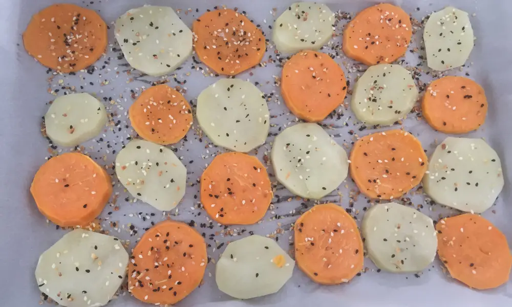 - Once cooked, remove the sweet potato medallions from the oven and let them cool slightly.