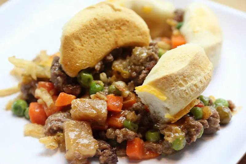 - Spray a 12 x 8-inch casserole dish with cooking spray and spoon in the meat mixture. Cut the biscuits in half and place them cut side down around the edge of the casserole. Bake uncovered for 15 to 20 minutes or until biscuits are golden brown and done. Top with the remaining cheese and French fried onions. Bake for an additional 5 minutes or until onions are golden brown and cheese is melted.