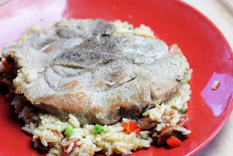 - Remove pork chops to a serving platter, cover with aluminum foil, and let rest for 5 minutes. (when removing the chops scrap any rice sticking to the chops back into the pan)