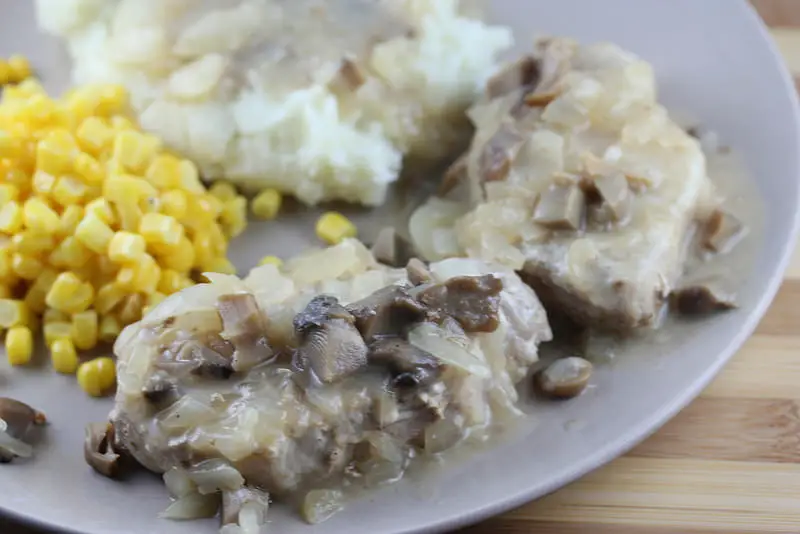 Pork chops with mashed potatoes and gravy always go well in this house for supper. This Pork Chops in Country Onion and Mushroom Gravy recipe looked really good so I thought I would give it a try. This is a simple recipe that doesn’t require many ingredients and doesn’t take that long to cook. You can have supper on the table in less than an hour.