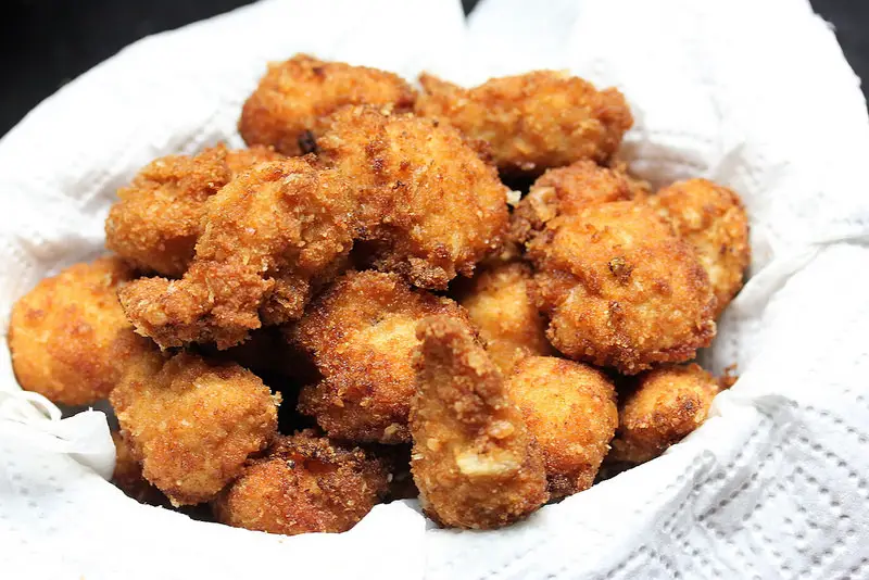 - Roll the chicken pieces one piece at a time in the crumb mixture and deep fry in batches until golden brown and crispy. Place on paper towels to drain any excess oil.