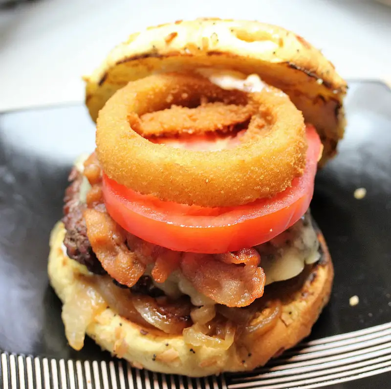 - To put it all together coat the bottom half of buns with the sauce, place the cooked onions on the bun followed by the burger, bacon and then the tomato. Spread more sauce over the tomato and then top with a deep-fried onion. Place top half of the bun on the mixture and enjoy.