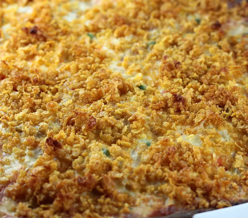 - Heat butter in a small saucepan until just melted – stir in corn flakes until well combined. Sprinkle corn flakes mixture over the casserole.