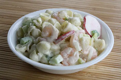 - Mix cooked macaroni, shrimp, onion, celery, green pepper, and radishes together in a salad bowl.