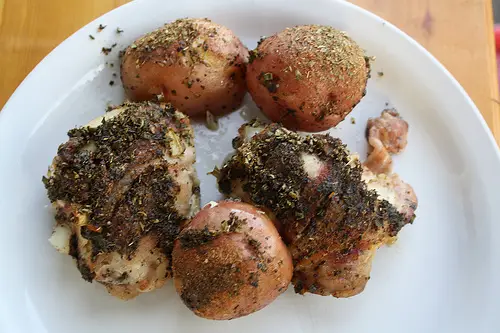 I love good one-dish meals. There is less clean up and they can be a real time saver. Bacon-wrapped chicken thighs with baby red potatoes, roasted with onions and herbs, a very delicious and simple dinner.