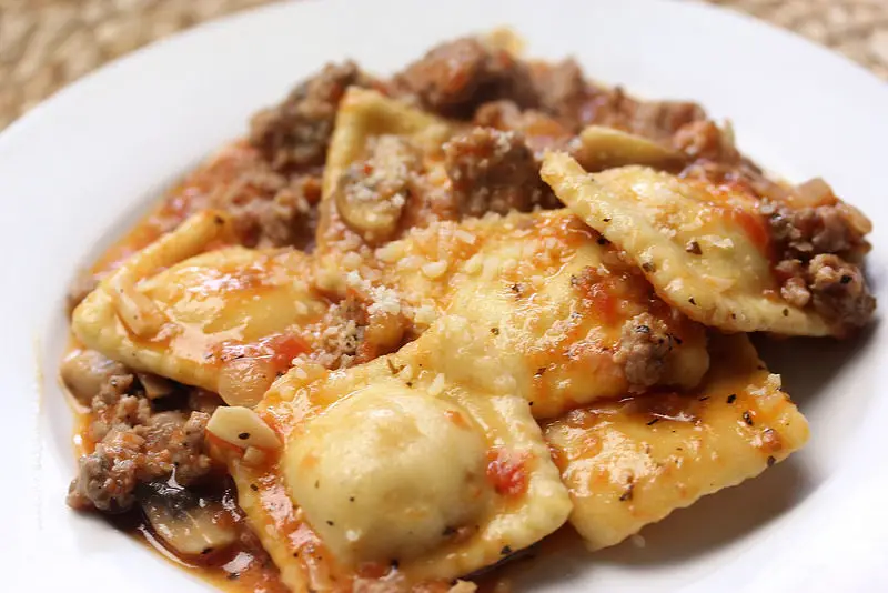 Here is another simple one dish recipe that is just the right amount for serving 2 people. It uses store bought ravioli witch reduces the prep time considerably and cooks fairly quickly.