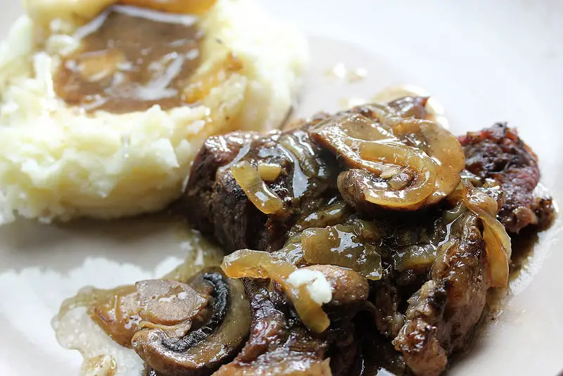 - Remove steaks and spoon off any excess fat from the gravy. Serve gravy over steaks and mashed potatoes.