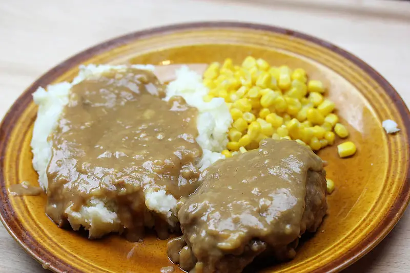 - Serve hot with the gravy over the top of the patties and mashed potatoes.