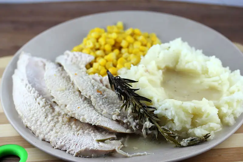 - Pat turkey breast dry and season generously with salt and pepper. Place turkey in slow cooker meat side up, cover, and cook 5 – 6 hours on low to an internal temperature of 160F. Remove turkey from the slow cooker onto a platter, tent with aluminum foil and let rest for 15 to 20 minutes.