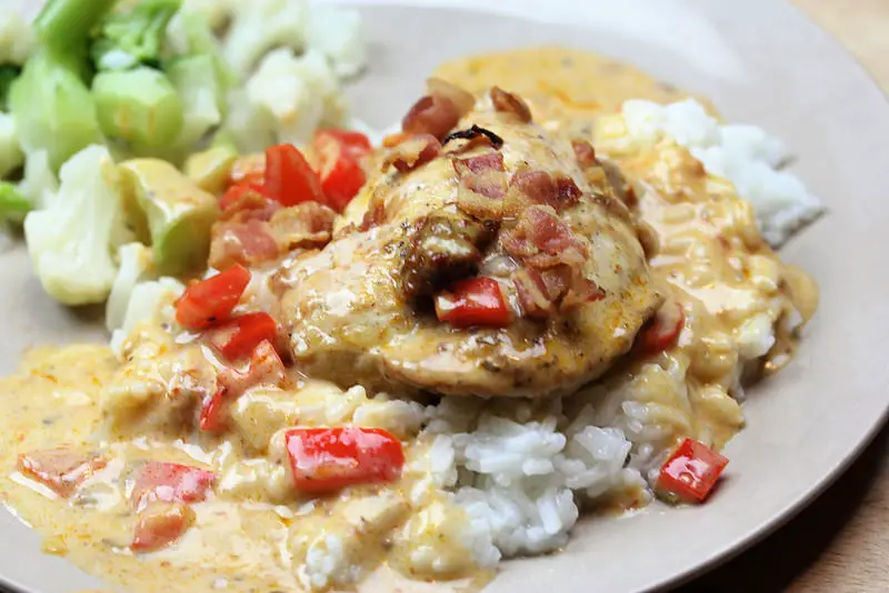 The sun-dried tomato pesto gives this Smothered Chicken Bake recipe a delicious and unique flavor. This is a simple recipe that requires few ingredients, and is quick to prepare; you can have this dish on the table in less than an hour.