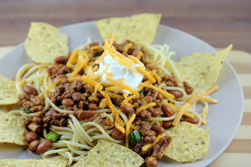 - Serve over spaghetti topped with Shredded cheddar cheese and sour cream.