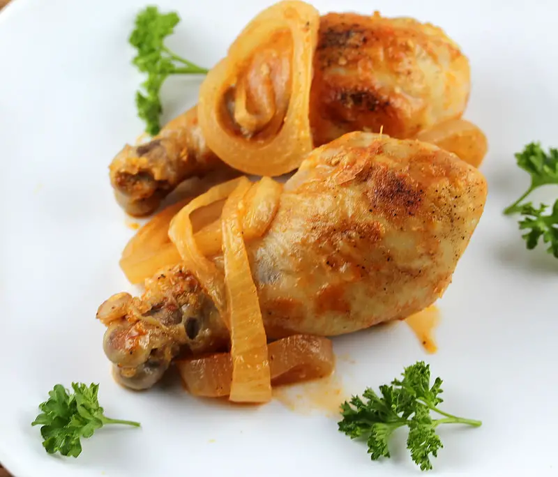 - Lightly spray a 13 x 9 casserole dish with cooking spray and arrange onion slices over the bottom. Arrange the chicken legs in a single layer on top of the onions, and then lightly season the chicken with the pepper.