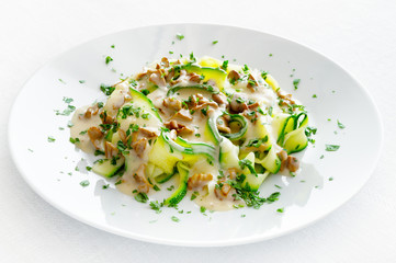 - Sauté garlic in oil and hot pepper flakes in a big skillet. Stir in the drained zucchini and parsley, then cover and cook for 5 to 10 minutes. Toss with the pasta, then season with salt and pepper to taste.