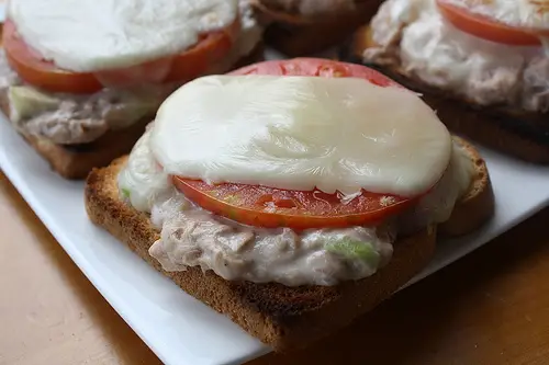 - Place 1 cheese slice over the tuna salad on each piece of bread, layer with a tomato slice, and top with remaining cheese slices.