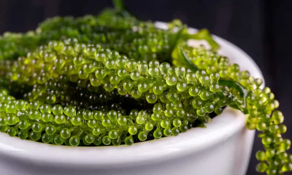 It is a kind of seaweed named by the way it looks, which is like little clusters of green grapes. The leafy portion of the aquatic plant that grows on long edible stems is made up of clear, green, and tiny edible grapes. They are typically eaten raw with rice, soups, salads, and sauces, and are a delightful culinary item with a distinctive flavor and intriguing texture.